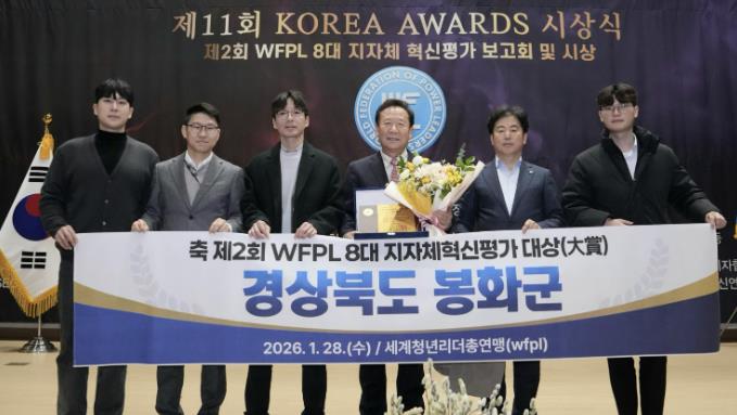 [뉴스노크=김인호 기자] 봉화군이 세계청년리더총연맹(WFPL) 부설 지자체혁신평가위원회(GEC)가 주관한 ‘제2회 WFPL 8대 지자체 혁신평가’에서 기관 부문 최고 영예인 ‘대상(大賞)’을 수상했다.