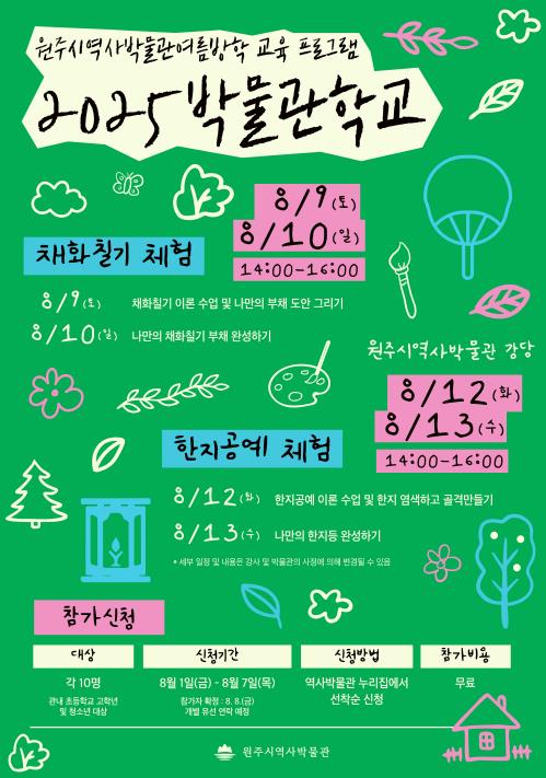 [뉴스노크=김인호 기자] 원주시역사박물관은 여름방학을 맞아 오는 9일부터 어린이와 청소년을 위한 전통문화 체험 교육 프로그램 ‘2025 박물관학교’를 운영한다.