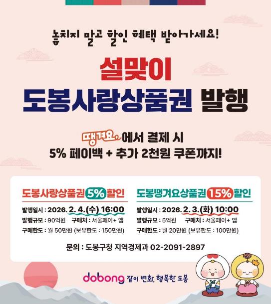 [뉴스노크=김인호 기자] 서울 도봉구가 민족 대명절 설을 맞아 90억 원 규모의 도봉사랑상품권과 5억 원 규모의 도봉땡겨요상품권을 발행한다.