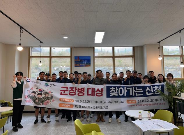 [뉴스노크=김인호 기자] 원주시는 9월 30일부터 10월 1일 이틀간 군 장병 대상 “찾아가는 신청”을 접수받기 위해 항공사제71항공정비대대, 1군지사 2곳을 방문했다.