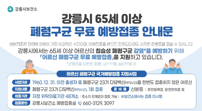 [뉴스노크=김인호 기자] 강릉시는 기온이 급격히 떨어지는 겨울철을 앞두고 면역력이 저하된 65세 이상 어르신들의 폐렴구균 예방접종률이 저조함에 따라, 중증 감염병 예방을 위한 시민들의 적극적인 접종 참여를 당부했다.