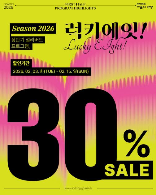 [뉴스노크=김인호 기자] 안동문화예술의전당은 상반기 주요 공연을 대상으로 30% 할인 혜택을 제공하는 특별 프로모션 ‘럭키에잇!’을 진행한다고 밝혔다.