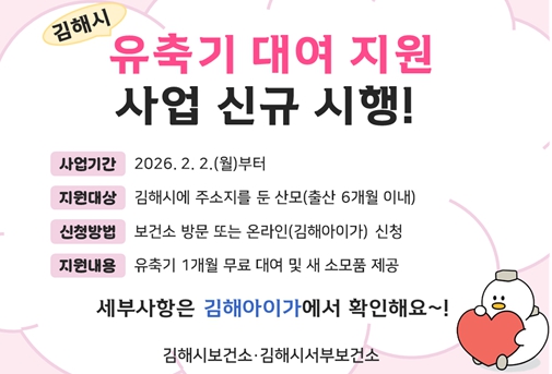 [뉴스노크=김인호 기자] 김해시는 출산가정의 경제적 부담을 완화하고 건강한 양육 환경 조성을 위해 오는 2월 2일부터 ‘유축기 대여 지원 사업’을 본격적으로 시행한다고 29일 밝혔다.