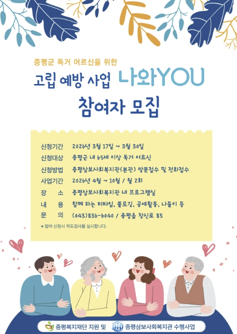 [뉴스노크=김인호 기자] 증평삼보사회복지관은 증평복지재단의 지원으로 독거 어르신 고립 예방 사업 ‘나와YOU’를 본격 운영한다고 밝혔다.