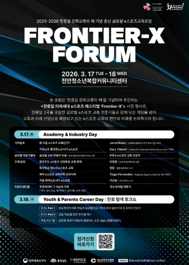 [뉴스노크=김인호 기자] 충남콘텐츠진흥원은 오는 3월 17일 ~ 18일 천안청소년복합커뮤니티센터에서 충남 글로벌 이스포츠 교육 포럼을 개최한다고 밝혔다.
