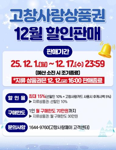 이번 12월 할인판매는 고창사랑카드는 12월17일 자정 전까지, 지류상품권의 경우 12월12일 오후 4시까지 구매할 수 있다.