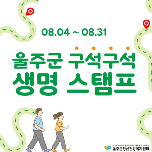 [뉴스노크=김인호 기자] 울주군정신건강복지센터가 오는 31일까지 모바일 걷기 앱 ‘워크온(WalkOn)’을 활용한 ‘자살예방 구조물 스탬프 챌린지’를 운영한다고 7일 밝혔다.