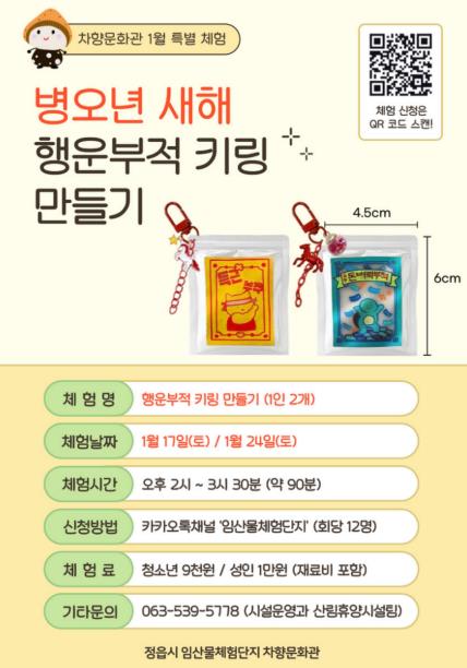 [뉴스노크=김인호 기자] 정읍시 임산물체험단지 내 차향문화관이 2026년 새해를 맞아 오는 17일과 24일, 온 가족이 함께 참여해 새해 소망을 비는 ‘행운 부적 키링 만들기’ 프로그램을 운영한다고 13일 밝혔다.