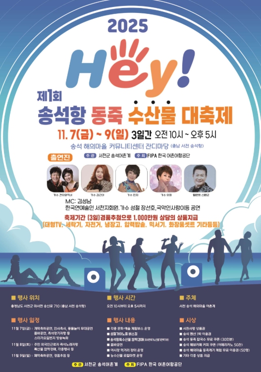 [뉴스노크=김인호 기자] 서천군 마서면 송석어촌계가 11월 7일부터 9일까지 사흘간 송석항 일원에서 ‘제1회 헤이(HEY) 송석항 동죽 수산물 대축제’를 연다.
