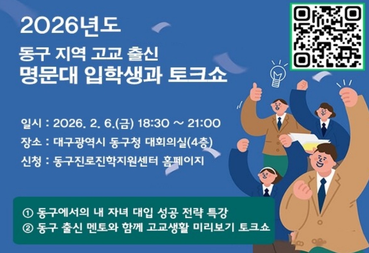 [뉴스노크=김인호 기자] 대구 동구청은 오는 6일 오후 6시 30분, 동구청 4층 대회의실에서 관내 학생 및 학부모를 대상으로 ‘2026 내 자녀 대입 성공 전략 특강 및 멘토와 함께 고교생활 미리보기 토크쇼’를 개최한다.