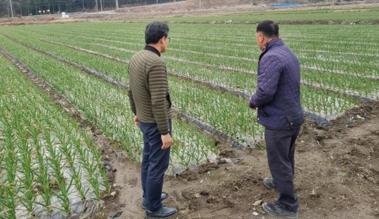 | ▲ 강진군 관계자가 강진관내 마늘농장을 방문했다. |