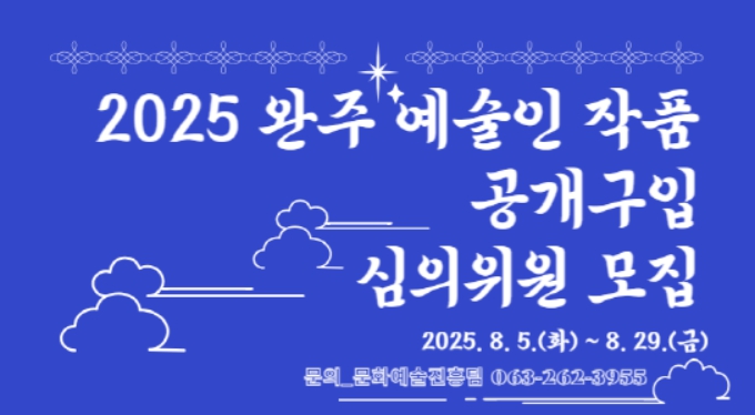 [뉴스노크=김인호 기자] (재)완주문화재단은 지역 문화예술 발전과 공정한 작품 선정 심의를 위해 2025 [완주 예술인 작품 공개 구입] 심의위원(후보자)를 모집한다고 밝혔다. 모집 기간은 8월 29일까지이며, 최종 선정된 위원은 완주 예술인 작품 공개 구입 심사에 참여하게 된다.