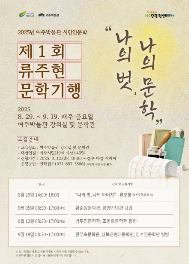 [뉴스노크=김인호 기자] 여주시 여주박물관은 오는 8월 29일부터 9월 19일까지 매주 금요일 ‘제1회 류주현 문학기행’을 개최한다.