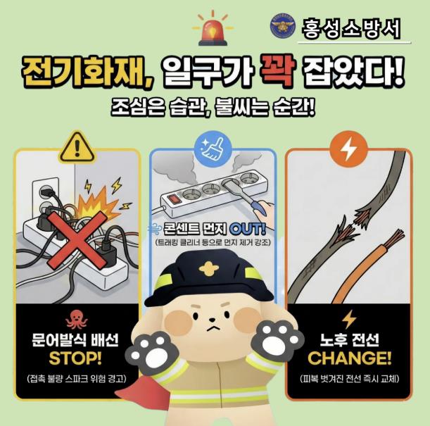 이에 홍성소방서는 공동주택과 전통시장을 대상으로 현장 안전지도를 실시하고, 전기설비 자율점검에 대한 홍보를 강화하는 한편, SNS를 활용한 예방 캠페인도 병행 추진할 계획이다.