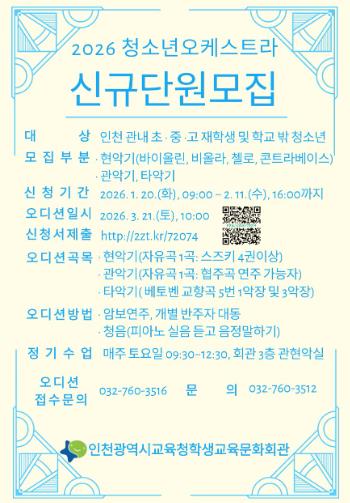 [뉴스노크=김인호 기자] 인천광역시교육청학생교육문화회관은 3월 21일 ‘2026학년도 청소년오케스트라 단원 모집 오디션’을 실시한다.