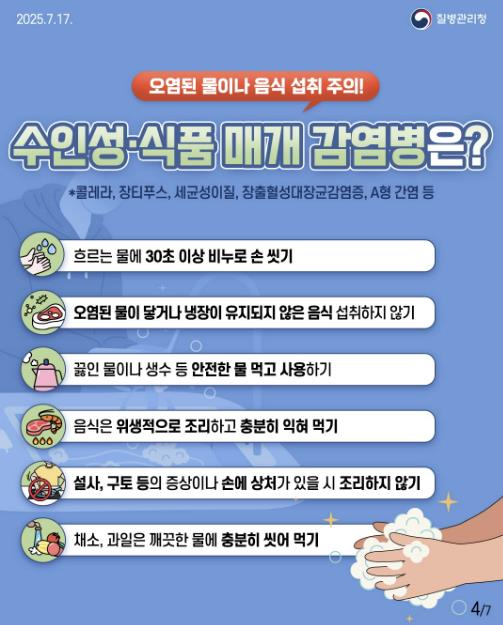 보건소는 수인성 감염병 예방을 위해 흐르는 물에 30초 이상 손을 씻고, 끓인 물이나 생수를 마시며, 손에 상처가 있을 경우 음식 조리를 피하고 음식은 반드시 익혀서 먹을 것을 당부했다.