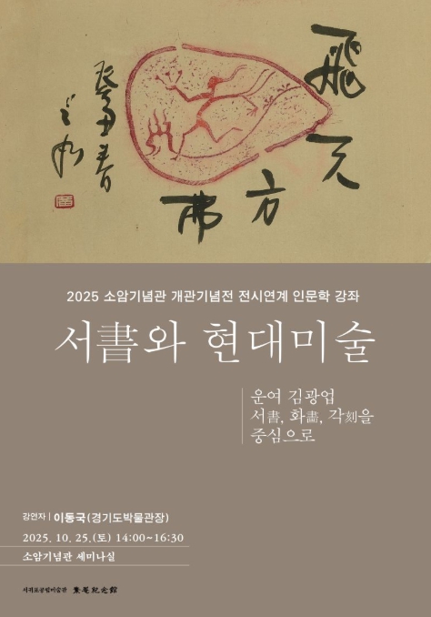 [뉴스노크=김인호 기자] 서귀포시 소암기념관에서는 2025년 세번째 인문학 강좌로 10월 25일 이동국 경기도박물관장을 초빙하여 '서書와 현대미술'을 진행한다고 밝혔다.