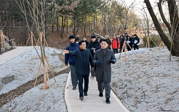 [뉴스노크=김인호 기자] 의정부시는 2026년 병오년 새해를 맞아 1월 8일 녹지 인프라 확충을 위한 주요 사업 대상지를 현장 점검했다. 점검 대상지는 ▲장암동 실외정원 ▲용현산업단지 완충녹지 산책로 및 가로숲길 조성 사업지 ▲민락동 감성쉼터 등이다. 이번 점검은 도심 속 쉼터와 실외정원 확충, 안전한 보행환경 조성, 산림 명소 발굴 등 녹지 인프라 조성 사업의 추진 현황을 점검하고, 시민들이 일상에서 녹지 공간을 보다 쉽게 이용할 수 있도록 추진 중인 ‘도시숲 프로젝트’의 사업 방향과 현장 여건을 확인하기 위해 진행됐다.