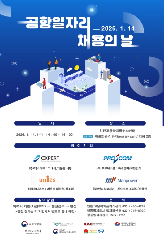 [뉴스노크=김인호 기자] 인천시 중구는 오는 14일 구월동 소재 인천고용복지플러스센터 지하 2층 채용행사장(남동구 문화로 131)에서 ‘2026년도 제1회 공항일자리 채용의 날’ 행사를 개최한다.