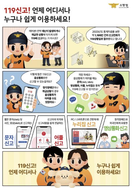 다매체 119 신고서비스는 기존 음성통화 방식 외에도 문자(SMS), 영상통화, 스마트폰 애플리케이션 등을 활용해 신고할 수 있는 제도다. 특히 청각·언어장애인 등 음성 통화가 어려운 경우나, 위급한 상황에서 말을 하기 곤란한 경우에 효과적으로 활용할 수 있다.