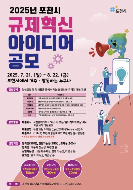 [뉴스노크=김인호 기자] 포천시는 불합리한 규제를 발굴·개선하기 위해 오는 8월 22일까지 ‘2025년 규제혁신 아이디어 공모’를 실시한다.