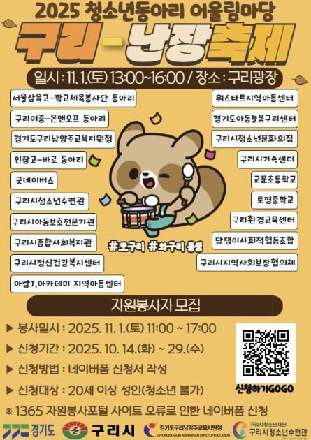 [뉴스노크=김인호 기자] 구리시청소년재단 청소년수련관은 오는 11월 1일 오후 1시부터 4시까지 구리광장에서‘2025 청소년동아리 어울림마당(구리-난장 축제)’을 개최한다. 이번 축제는 구리 지역 아동 청소년 네트워크 공동사업으로 추진되며, 청소년과 시민이 함께 즐길 수 있는 다양한 체험과 공연 프로그램이 마련되어 있다.