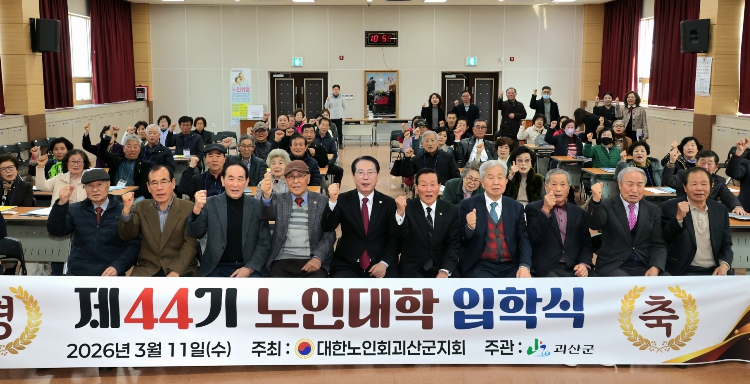 [뉴스노크=김인호 기자] 충북 괴산군은 11일 노인회 지회 3층 회의실에서 송인헌 괴산군수, 노인회 관계자, 이명남 학생대표 외 39명의 학생이 참석해 제44회 노인대학 입학식을 개최했다고 밝혔다.