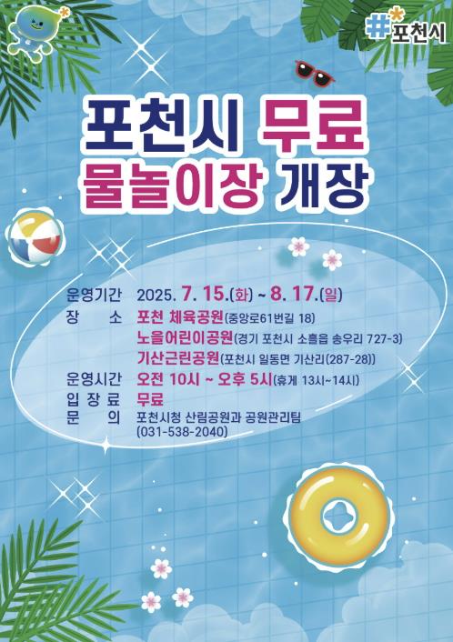 포천시 관계자는 “공원 물놀이장을 안전하게 운영해 아이들이 시원하고 즐거운 여름을 보낼 수 있도록 최선을 다하겠다”고 말했다.