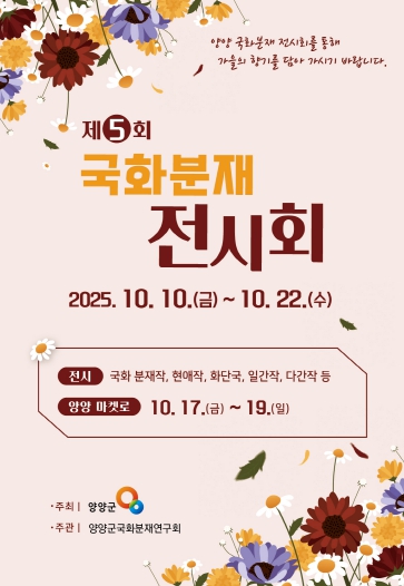 [뉴스노크=김인호 기자] 양양군 국화분재연구회(회장 윤종욱)는 오는 10일부터 22일까지 13일간 양양군농업기술센터에서 ’제5회 국화분재 전시회‘를 개최한다.