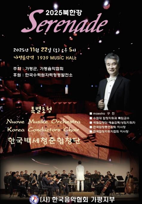 [뉴스노크=김인호 기자] 가평군과 가평음악협회가 공동 주최하고 한국수력원자력㈜ 청평발전소가 후원하는 ‘2025 북한강 세레나데’ 연주회가 오는 22일과 29일 음악역1939 뮤직홀에서 열린다.