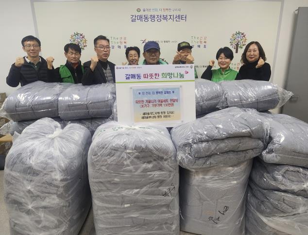 [뉴스노크=김인호 기자] 구리시는 지난 3일 오후 4시 갈매동 행정복지센터에서 갈매동 새마을지도자회와 새마을부녀회가 에너지 취약계층 30가구에 130만 원 상당의 친환경 겨울 이불 30세트를 지원했다고 밝혔다.