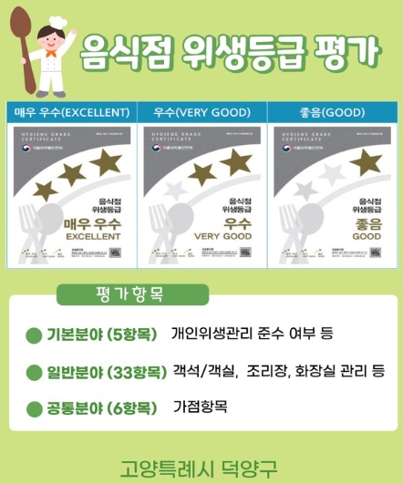 위생등급제는 음식점의 위생 상태를 평가해 ‘매우 우수’, ‘우수’ 등 등급을 부여하고 이를 소비자가 확인할 수 있도록 하는 제도이다. 덕양구는 등급의 신뢰도를 높이고 지정 업소의 위생관리 수준을 지속적으로 유지하기 위해 사후관리를 강화하고 있다.