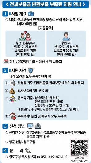 영도구 관계자는 “최근 전세 사기와 역전세 현상으로 보증금을 돌려받지 못하는 피해가 잇따르고 있어 각별한 주의가 필요하다”며 “많은 구민이 본 제도를 적극 활용해 소중한 재산을 보호하시길 바라며, 앞으로도 안전한 전세 거래 문화 정착을 위해 최선을 다하겠다”고 말했다.