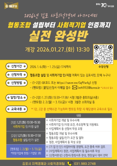 [뉴스노크=김인호 기자] 김포시가 사회문제 해결을 위한 참신한 아이디어와 실행력을 갖춘 사회적경제기업 육성을 위해 '2026년 김포시 사회적경제 아카데미'를 개설하고, 오는 1월 23일까지 수강생을 모집한다.