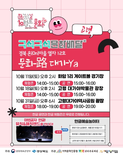 [뉴스노크=김인호 기자] 2025 문화가 있는 날 '구석구석 문화배달' 경북 온(On)마을 열차 12호 고령군 ‘문화路 대가ya’가 10월 문화의 달을 맞아 총 3회의 공연을 선보인다. 이번 행사는 문화체육관광부와 경상북도가 주최하고, 지역문화진흥원·경북문화재단·예술마을사람들이 주관하며, 고령군과 협력해 진행된다.