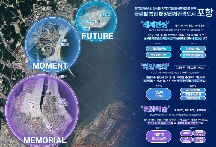 재정사업(안)으로는 ▲환호공원 해양 예술 거점 조성 ▲복합마리나 구축 ▲글로벌 해양경관 특화 ▲송도 복합 해양문화관광시설 건립 ▲송도솔숲‧포항운하 명소화가 있으며 민간투자사업으로는 ▲해양레저지원센터 ▲대관람차 ▲특급호텔 ▲옛 포항역 복합개발(1·2지구) 등 9개 사업이 연계된다.
