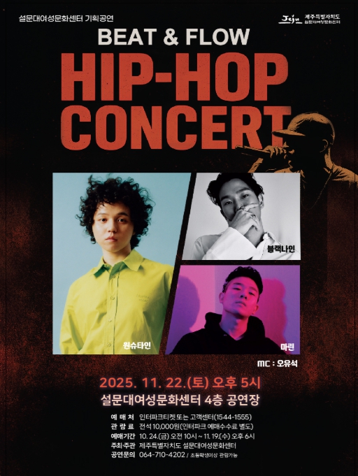 [뉴스노크=김인호 기자] 제주특별자치도 설문대여성문화센터는 ‘설문대 문화의 날’ 11월 기획공연으로 ‘원슈타인·블랙나인·마린 힙합콘서트’를 11월 22일 오후 5시에 공연장에서 선보인다고 밝혔다.