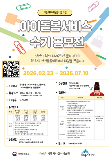 김지현 세종시아이돌봄광역지원센터장은 “이번 수기 공모전이 아이돌봄서비스를 통해 경험한 일상의 변화와 감동을 나누는 계기가 되길 바란다”며 “수기에 담긴 현장의 목소리를 적극 반영해 세종시 아이돌봄 서비스가 더욱 신뢰받는 서비스로 발전할 수 있도록 노력하겠다”고 말했다.