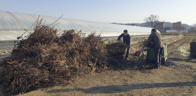 영농부산물 안전처리 지원 사업은 영농부산물(옥수수, 고춧대, 깻대 등)을 파쇄해 퇴비로 활용하는 사업이다.