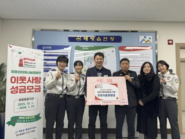 [뉴스노크=김인호 기자] 배방읍 장재자율방범대는 지난 15일 배방읍 행정복지센터에서 지역 내 어려운 이웃을 돕기 위한 ‘희망2026 나눔캠페인’에 동참해 성금 100만 원을 전달했다.
