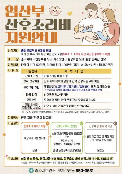 충주시 보건소 관계자는 “임신 16주 이후 유산이나 사산을 겪은 산모 역시 충분한 보호와 지원이 필요하다는 공감대가 형성됐다”며 “앞으로도 시민 체감도가 높은 출산·양육 지원 정책을 지속적으로 발굴하고 확대해 나가겠다”고 말했다.