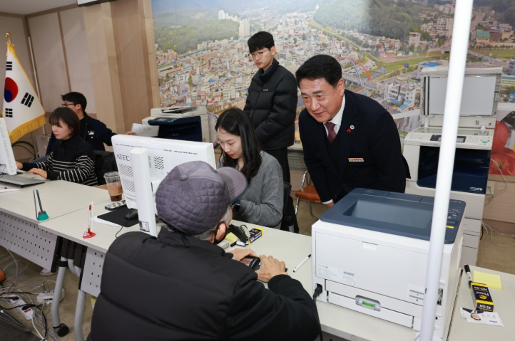 정영철 영동군수는 이날 영동읍사무소 신청 현장을 직접 찾아 접수·지급 절차 전반을 점검하고, 지원금 신청을 위해 방문한 주민들과 인사를 나누며 신청 과정과 선불카드 이용 방법을 안내했다.