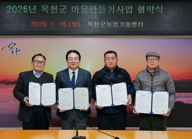 [뉴스노크=김인호 기자] 옥천군은 1월 26일 오후 2시, 옥천군농업기술센터 2층 소회의실에서 ‘2026년 옥천군 마을만들기사업 협약식’을 열고 동이면 금암2리, 안남면 도덕1리, 청산면 한곡리 등 3개 마을과 협약을 체결했다.