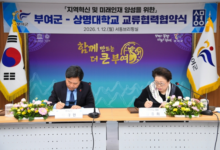 [뉴스노크=김인호 기자] 부여군은 지역혁신과 미래 신산업·문화콘텐츠 산업 분야의 인재를 양성하고, 창업 및 산업 활성화를 지원함으로써 지역경제 발전과 지속 가능한 협력체계를 구축하기 위하여 상명대학교와 업무협약(MOU)을 체결했다고 14일 밝혔다.