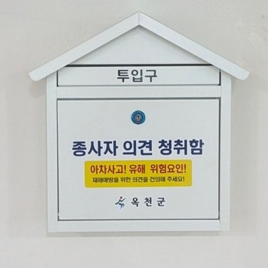 [뉴스노크=김인호 기자] 옥천군은 종사자의 안전·보건을 보다 체계적으로 관리하고, 현장의 다양한 목소리를 폭넓게 수렴해 군정에 적극 반영하기 위해 군청 및 읍·면사무소 등 주요 공공시설 16개소에 총 21개의 종사자 의견청취함을 설치·운영한다고 밝혔다.