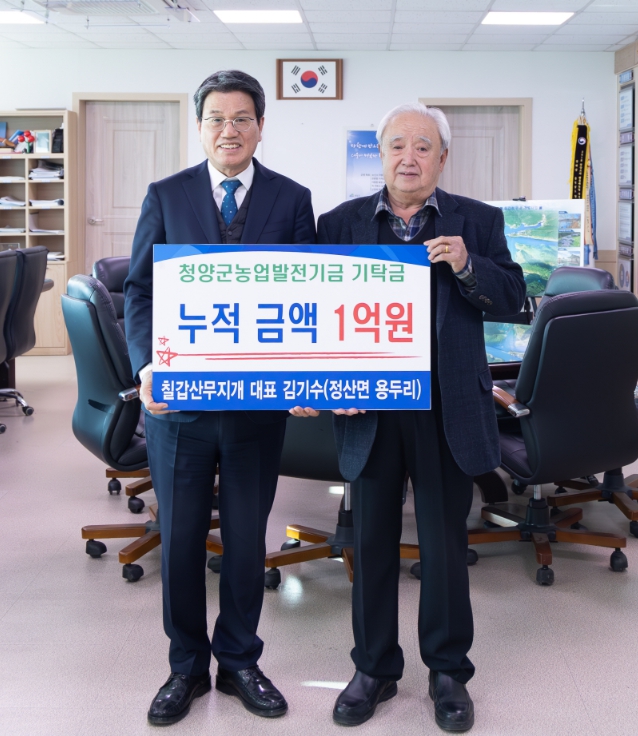 [뉴스노크=김인호 기자] 청양군은 정산면 용두리 소재 ‘칠갑산무지개’의 김기수 대표가 군청을 방문해 농업발전기금 1,000만 원을 기탁하면서 올해로 마침내 누적 기탁금 1억 원을 달성했다고 밝혔다.
