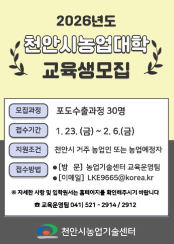 [뉴스노크=김인호 기자] 천안시농업기술센터는 내달 6일까지 ‘2026년도 천안시농업대학’ 교육생 30명을 모집한다고 23일 밝혔다.