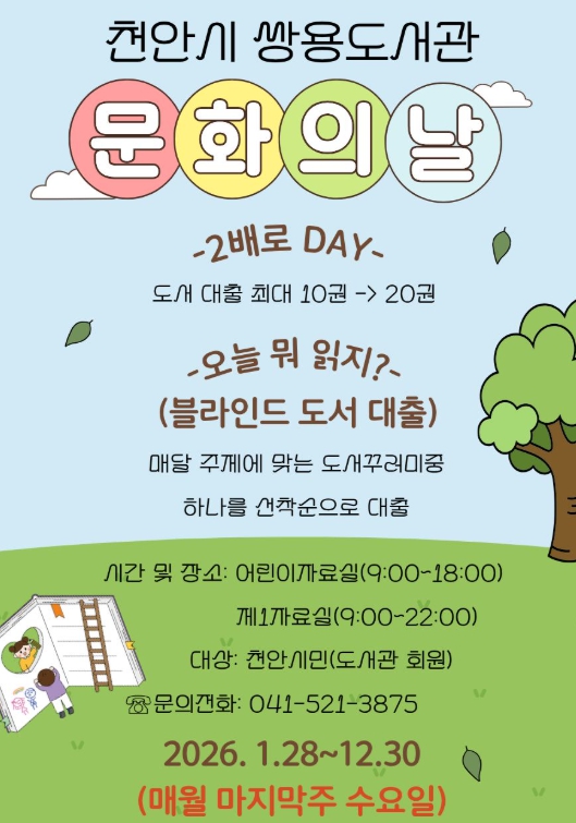 [뉴스노크=김인호 기자] 천안시 쌍용도서관은 매달 마지막주 수요일 ‘2026 문화가 있는 날’ 행사를 운영한다고 16일 밝혔다.