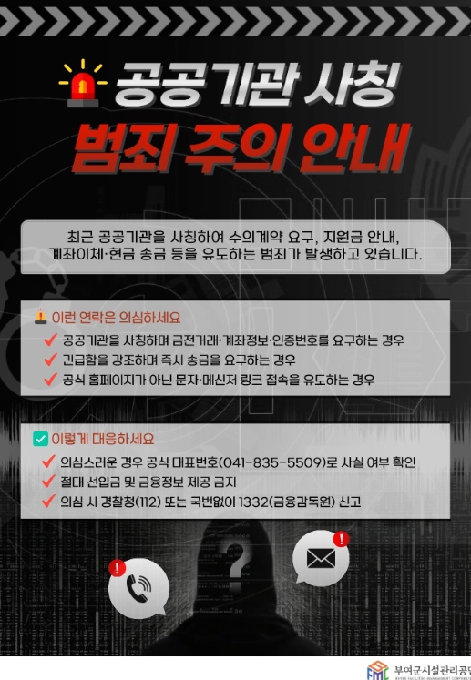 [뉴스노크=김인호 기자] 부여군시설관리공단은 최근 공공기관을 사칭해 물품 대리구매나 수의계약을 가장하고 선입금을 요구하는 사기 시도가 발생하고 있다며, 관내 업체와 협력사를 대상으로 각별한 주의를 당부했다.