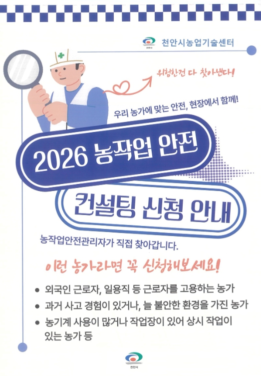 [뉴스노크=김인호 기자] 천안시농업기술센터는 오는 3월까지 ‘농작업 안전컨설팅’ 참여 농가를 모집한다고 16일 밝혔다.